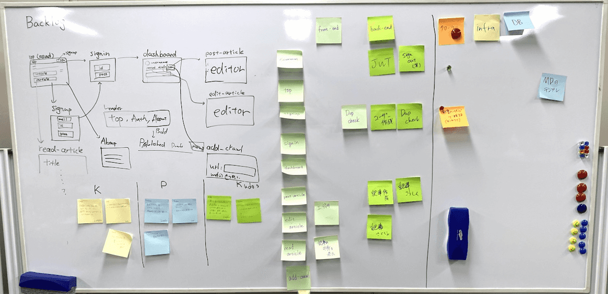 アイディア出しをして、方向性を明確にしていきました。このときあまり意見が言えなかったことを反省しています。最初からガツガツな感じでいけるようにしたいです。 使用する技術、割り振りを決めたら開発スタート。短期間でどれぐらいのものが作れるか不安なお気持ち表面しながら作業を進めていきます。